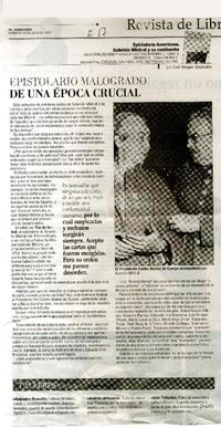 Epistolario malogrado de una época crucial [artículo] / Luis Vargas Saavedra. El Mercurio (Diario : Santiago, Chile) Julio 22, 2012, ppagina E17, (suplemento "Revista de Libros") 1 página : ilustración en blanco y negro ; 30,5 cm. .