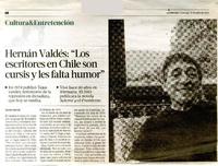Hernán Valdés: "Los escritores en Chile son cursis y les falta amor" [artículo] / Javier García. La Tercera (Diario : Santiago, Chile)-- jul. 22, 2012, p. 58-59. .