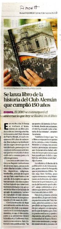 Se lanza libro de la historia del Club Alemán que cumplió 150 años. [artículo] El Llanquihue (Diario : Puerto Montt, Chile)-- mayo 4, 2012, p. 3. .