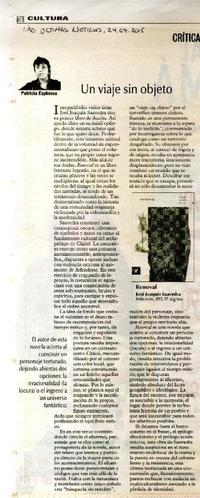 Un viaje sin objeto [artículo] / Patricia Espinosa Las Últimas Noticias (Diario : Santiago, Chile) abril 24, 2015, p. 76 .