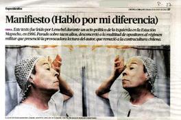 Manifiesto (hablo por mi diferencia). [artículo] Crónica Chillán (Diario : Chillán, Chile)-- ene. 24, 2015, p. 27. .