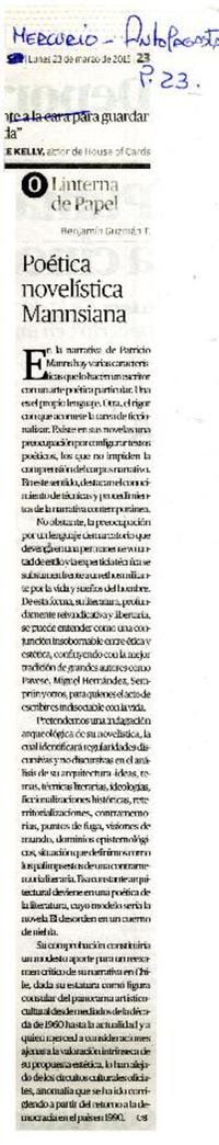 Poética novelística Mannsiana. [artículo] / Benjamín Guzmán T. El Mercurio (Diario : Antofagasta, Chile) marzo 23, 2015, p. 23 .