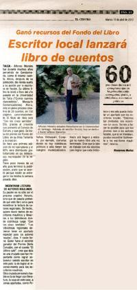 Escritor local lanzará libro de cuentos [artículo] / Macarena Muñoz. El Centro (Diario : Talca, Chile)-- abr. 10, 2012, p. 23. .