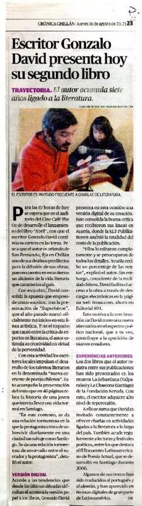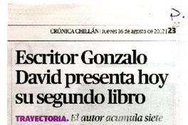 Escritor Gonzalo David presenta libro hoy su segundo libro. [artículo] Crónica Chillán (Diario : Chillán, Chile)-- ago. 16, 2012, p. 23. .
