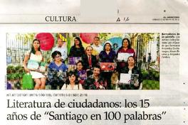 Literatura de ciudadanos: los 15 años de "Santiago en 100 palabras" [artículo] / Iñigo Díaz. El Mercurio (Diario : Santiago, Chile)-- mayo 2, 2015, p. A16. .