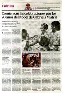 Comienzan las celebraciones por los 70 años del Nobel de Gabriela Mistral [artículo] / Flor Arbulú. El Mercurio (Diario : Valparaíso, Chile)-- abr. 8, 2015, p. 26. .