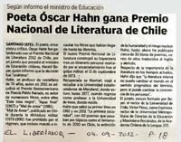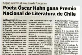Poeta Óscar Hahn gana premio nacional de literatura de Chile. [artículo] El Libertador (Diario : Rancagua, Chile)-- sept. 4, 2012, p. 18. .