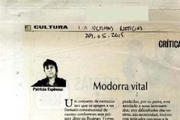 Modorra vital [artículo] / Patricia Espinosa. Las Últimas Noticias (Diario : Santiago, Chile)-- mayo 29, 2015, p. 76. .