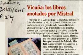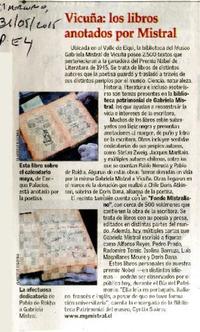 Vicuña: los libros anotados por Mistral [artículo]. El Mercurio (Diario : Santiago, Chile)-- mayo 13, 2015, p. E4 (suplemento "Artes y Letras" "Revista de Libros"). .