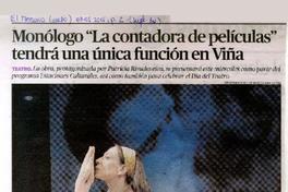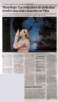 Monólogo "la contadora de películas" tendrá una única función en Viña [artículo]. El Mercurio (Diario : Valparaíso, Chile)-- mayo 03, 2015, p. 2 (suplemento "KU"). .