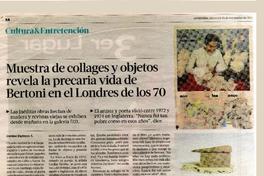 Muestra de collages y objetos revela la precaria vida de Bertoni en el Londres de los 70 [artículo] / Denisse Espinoza A. La Tercera (Diario : Santiago, Chile)-- nov. 23, 2011, p. 54. .
