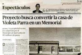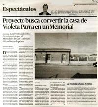 Proyecto busca convertir la casa de Violeta Parra en un Memorial [artículo] / Dominique Mesina A. Crónica Chillán (Diario : Chillán, Chile)-- jul. 16, 2014, p. 20. .