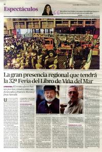 La gran presencia regional que tendrá la 32a Feria del Libro de Viña del Mar. [artículo] El Mercurio (Diario : Valparaíso, Chile)-- ene. 9, 2014, p. 26. .