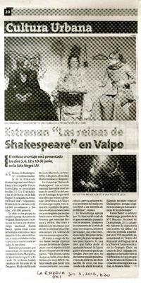 Estrenan "las reinas de Shakespeare" en Valpo. [artículo] La Estrella (Diario : Valparaíso, Chile)-- jun. 3, 2015, p. 20. .