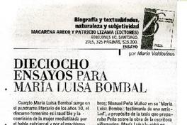 Dieciocho ensayos para María Luisa Bombal [artículo] / Mario Valdovinos. El Mercurio (Diario : Santiago, Chile)-- jun. 28, 2015, p. E12 (suplemento "Revista de Libros") .