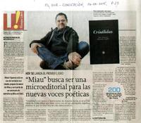 "Miau" busca ser una microeditorial para las nuevas voces poéticas [artículo] / Sebastián Grant del Río. El Sur (Diario : Concepción, Chile)-- jun. 26, 2015, p. 23, (suplemento "Tiempo Libre") .