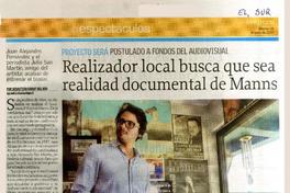 Realizador local busca que sea realidad documental de Manns [entrevista] / [artículo] : Sebastián Grant del Río. El Sur (Diario : Concepción, Chile)-- jun. 16, 2015, p. 22. .