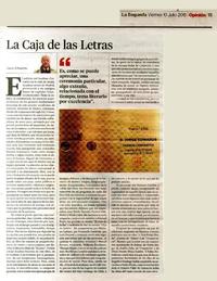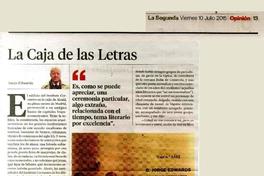 La caja de las letras [artículo] / Jorge Edwards. La Segunda (Diario : Santiago, Chile)-- jul. 10, 2015, p. 13. .