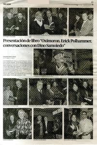 Presentación de libro "Oxímoron Erick Polhammer, conversaciones con Dino Samoiedo" / [artículo] : Mónica Zamora. El Mercurio (Diario : Valparaíso, Chile)-- oct. 27, 2013, p. 29. .
