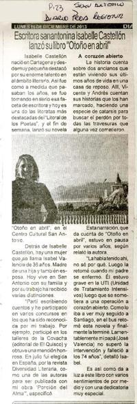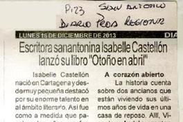 Escritora sanantonina Isabelle Castellón lanzó su libro "Otoño en abril". [artículo] Proa Regional (Diario : San Antonio, Chile)-- dic. 16, 2013, p. 23. .