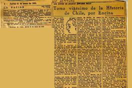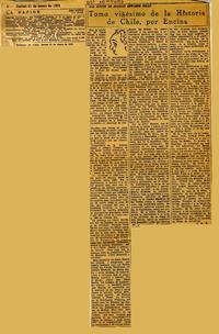 Tomo vigésimo de la historia de Chile, por Encina [artículo] / Joaquín Edwards Bello. La Nación (Diario : Santiago, Chile)-- ene. 31, 1952, p. 4. .