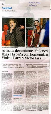 Armada de cantantes chilenos llega a España con homenaje a Violeta Parra y Víctor Jara [artículo] / Andrés del Real. La Tercera (Diario : Santiago, Chile)-- jul. 16, 2015, p. 40. .