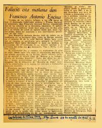 Falleció esta mañana don Francisco Antonio Encina. [artículo] Las Noticias de última Hora (Diario : Santiago, Chile)-- ago. 23, 1965, p. 16. .