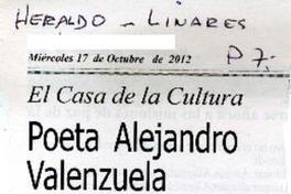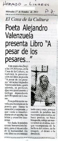 Poeta Alejandro Valenzuela presenta libro "A pesar de los pesares..." [artículo] El Heraldo (Diario : Linares, Chile)-- oct. 17, 2012, p. 7. .
