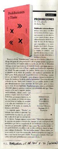 Prohibiciones títulos [artículo] / Rodrigo Pinto. El Mercurio (Diario : Santiago, Chile)-- ago. 15, 2015, p. 40 (suplemento "Sábado") .
