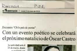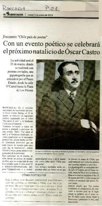 Con un evento poético se celebrará el próximo natalicio de Óscar Castro. [artículo] El Libertador (Diario : Rancagua, Chile)-- Enero 3, 2012, página 21. .