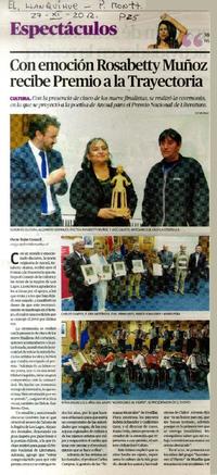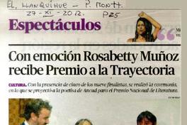 Con emoción Rosabetty Muñoz recibe premio a la trayectoria [artículo] / Oscar Rojas Connell. El Llanquihue (Diario : Puerto Montt, Chile)-- Noviembre 27, 2012, página 25. .