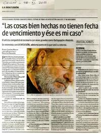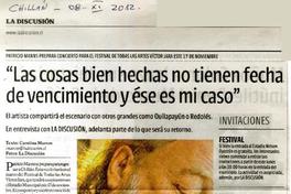 "Las cosas bien hechas no tienen fecha de vencimiento y ése es mi caso" [entrevista] [artículo] / Carolina Marcos. La Discusión (Diario : Chillán, Chile)-- Noviembre 8, 2012, página 19. .