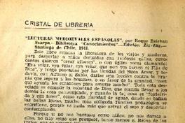 "Lecturas medioevales españolas" [artículo] / Alfredo Lefebvre. Estudios (Revista : Santiago, Chile)-- no 102 (Junio-Julio, 1941), página 67-70. .