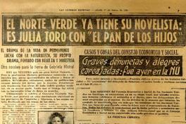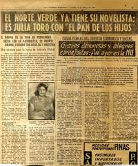 El norte verde ya tiene su novelista: es Julia Toro con "el pan de los hijos". [artículo] Las Últimas Noticias (Diario : Santiago, Chile)-- Marzo 17, 1951, páginas 7 y 22. .