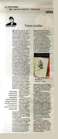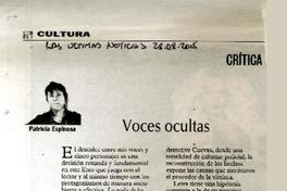 Voces ocultas [artículo] / Patricia Espinosa. Las Últimas Noticias (Diario : Santiago, Chile)-- Agosto 28, 2015, página 76. .