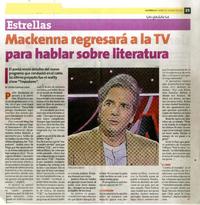 Mackenna regresará a la TV para hablar sobre literatura [entrevista] [artículo] / Camila Espinoza López. La Estrella (Diario : Valparaíso, Chile)-- Agosto 3, 2015, páginas 25. .