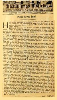 Poesía de Olga Solari [artículo] / Raúl Cuevas. Las Últimas Noticias (Diario : Santiago, Chile)-- Febrero 4, 1945. .