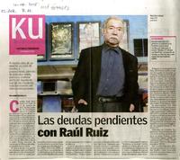 Las deudas pendientes con Raúl Ruiz [artículo] / Andrés Nazarala. El Sur (Diario : Concepción, Chile)-- agosto 16, 2015, página 11 (suplemento "KU") El Mercurio (Diario : Valparaíso, Chile)-- .