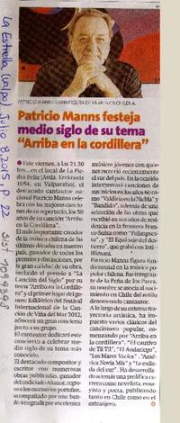 Patricio Manns festeja medio siglo de su tema "Arriba en la cordillera". [artículo] La Estrella (Diario : Valparaíso, Chile)-- julio 8, 2015, página 22. .