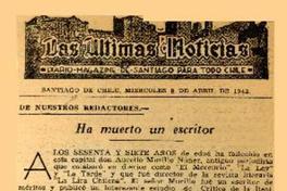 Ha muerto un escritor [artículo] / Manuel Rojas. Las Últimas Noticias (Diario : Santiago, Chile)-- abril 8, 1942. .