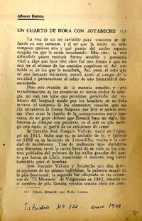 Un cuarto de hora con Jotabeche [artículo] / Alfonso Bulnes. Estudios (Revista : Santiago, Chile)-- no 120 (enero 1943), páginas 54-59. .