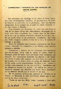 Campesinos y mineros en las novelas de Oscar Castro [artículo] / Manuel Montecinos. Estudios (Revista : Santiago, Chile)-- no 240 (septiembre-octubre 1954), páginas 22-30. .