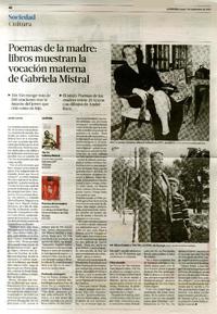 Poemas de la madre: libros muestran la vocación materna de Gabriela Mistral [artículo] / Javier García. La Tercera (Diario : Santiago, Chile)-- septiembre 7, 2015, página 42. .