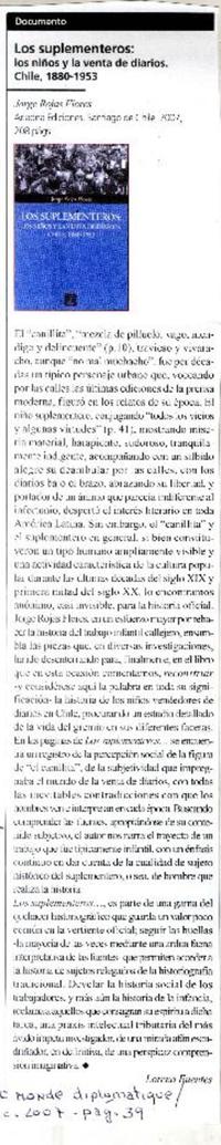 Los suplementeros: los niños y la venta de diarios. Chile, 1880-1953 [artículo] / Lorena Fuentes. Le Monde diplomatique (Diario : Santiago, Chile)-- (diciembre 2007), página 39. .