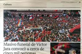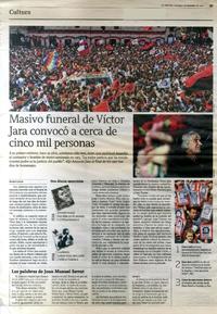 masivo funeral de Víctor Jara convocó a cerca de cinco mil personas [artículo] / Marisol García. La Tercera (Diario : Santiago, Chile)-- diciembre 6, 2009, página 97. .