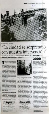 "La ciudad se sorprendió con nuestra intervención" [artículo] / Marcelo Macellari. El Mercurio (Diario : Valparaíso, Chile)-- diciembre 16, 2008, página 32. .