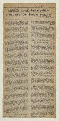ALUTEC" ofreció recital poético y musical a don Benigno Avalos A. [artículo] / Ismael Nuñez M. Atacama (Copiapó, Chile)-- mayo 3, 1977, p. 4. .