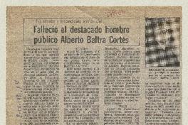 Falleció el destacado hombre público Alberto Baltra Cortés [artículo] / La Tercera (Diario : Santiago, Chile)-- sept. 8, 1981, p. 4. retr. .