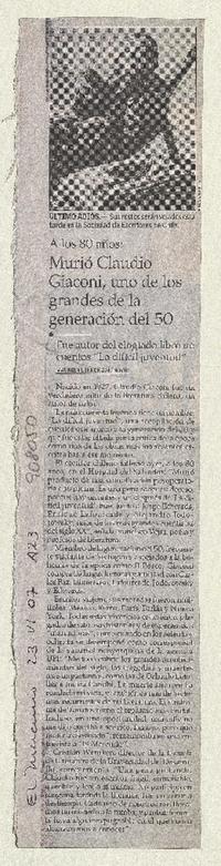 Murió claudio Giaconi, uno de los grandes de la generación del 50 [artículo] : Maureen Lennon Zaninovic.