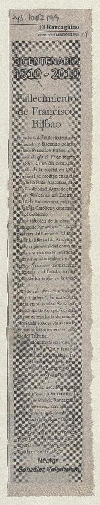Bicentenario 1810-2010 fallecimiento de Francisco Bilbao [artículo] / Héctor González Valenzuela. El Rancagüino (Diario : Rancagua, Chile)-- feb. 19, 2010, p. 4. .